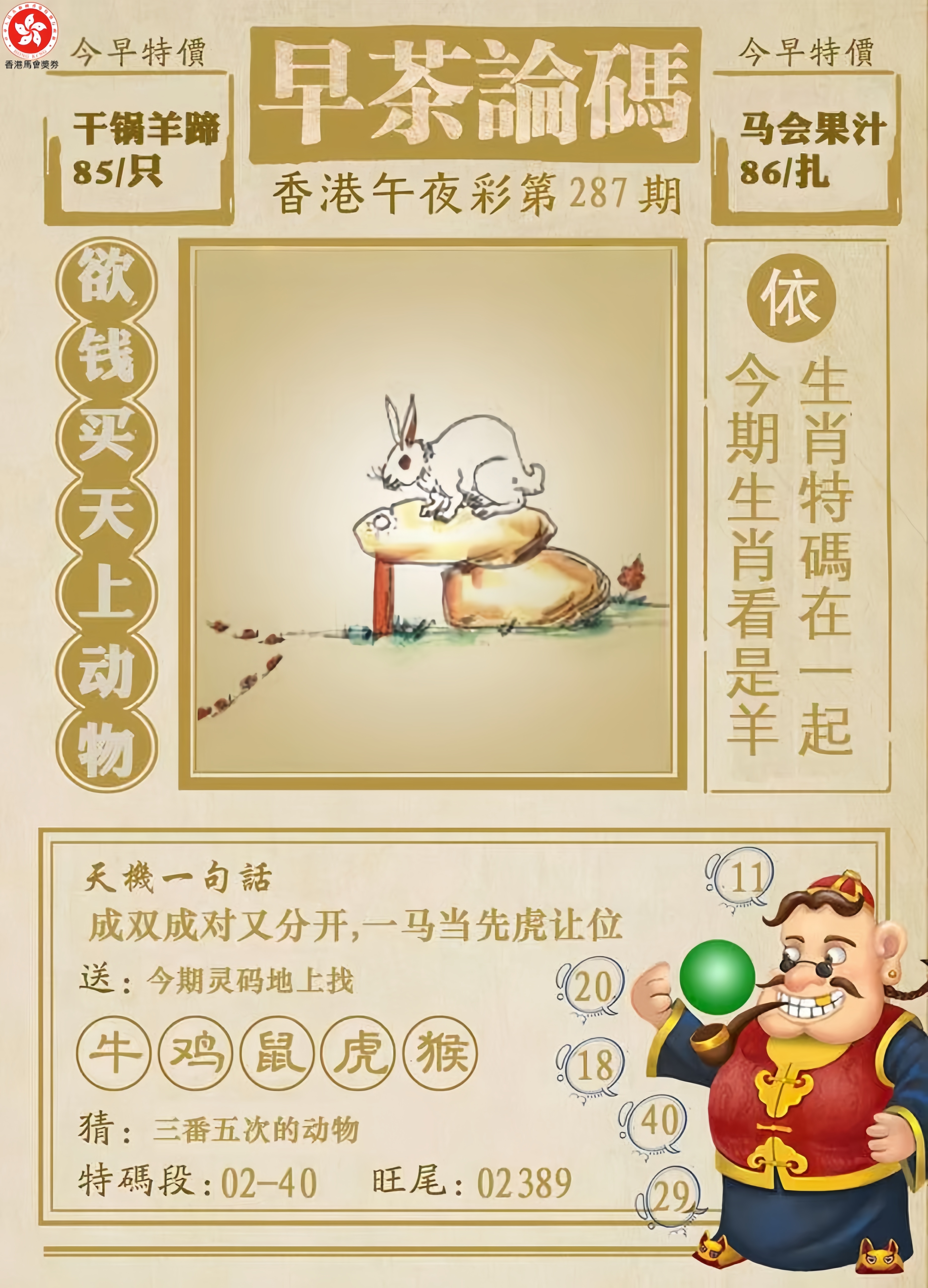 287期:⑨肖 | 羊虎龙鸡猴蛇狗兔牛 | 开:兔03 |
